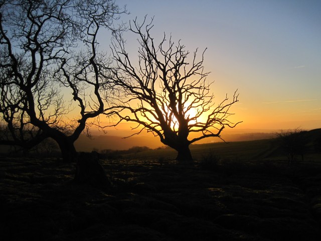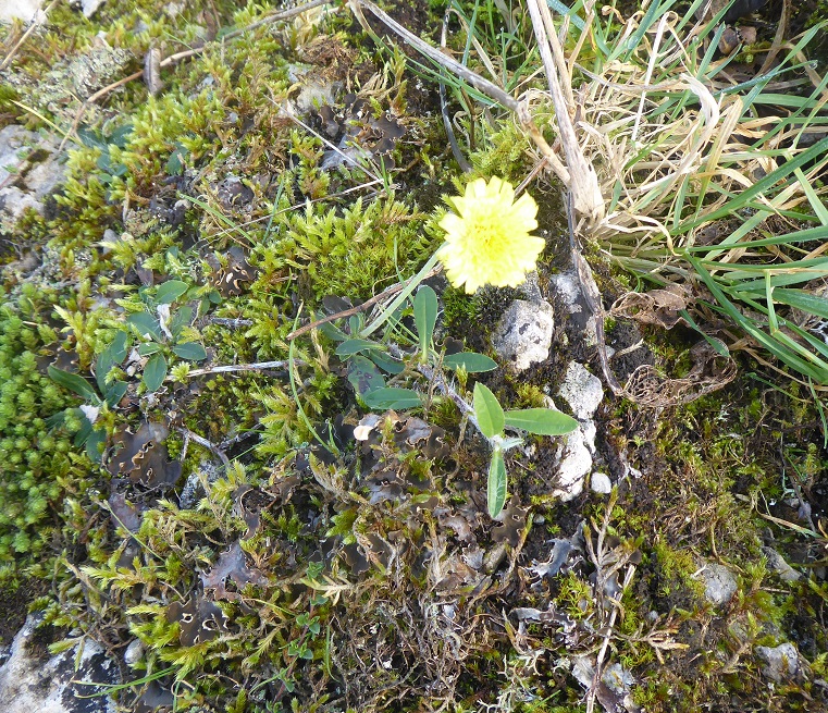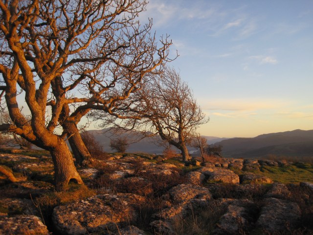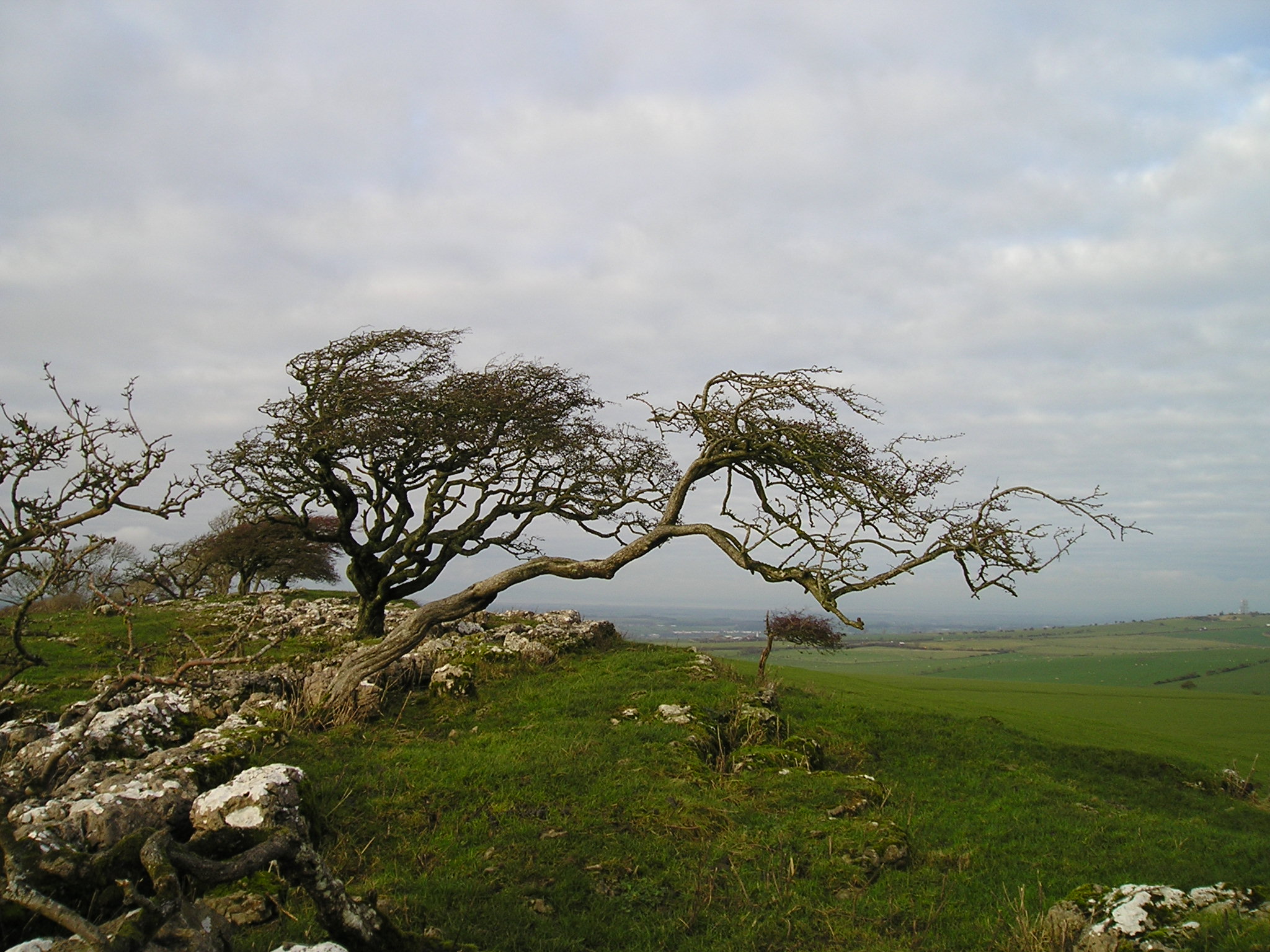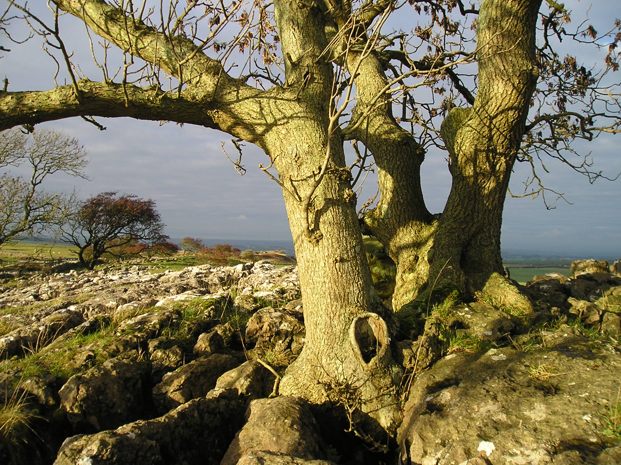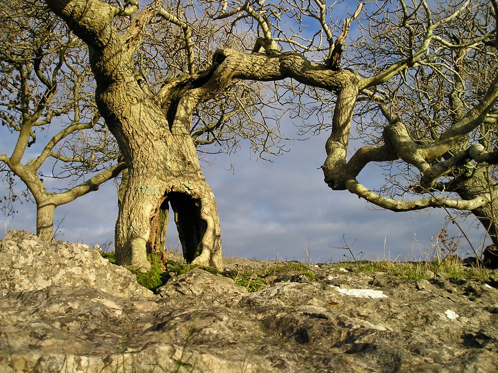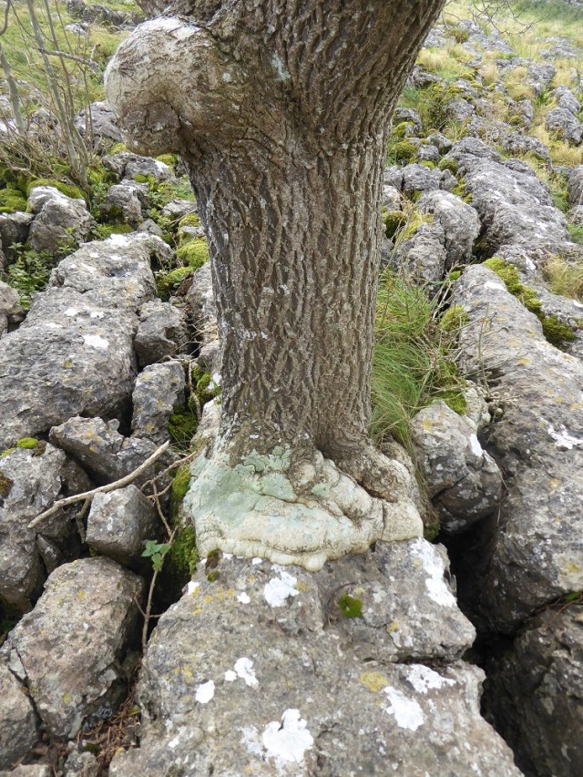 Area 1. To the North and in view of the Solway Firth, are narrow rough clints, only sparsely vegetated, with deep narrow grikes, amongst which sheep and sometimes cattle graze. The trees, predominantly hawthorns, are gnarled and bent, but nevertheless exist. There are interesting lichens on the rocks, with large patches of nearly-white Aspicilia in the light, unshaded areas.