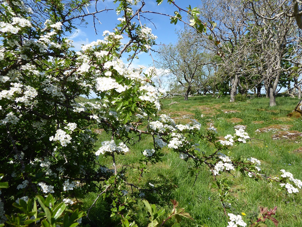The lushness of early summer. Hawthorns in flower, ashes coming into leaf, and grasses and mosses vibrant with colour. Seeing that thick carpet of green, who would guess that Area 2 is a limestone pavement?