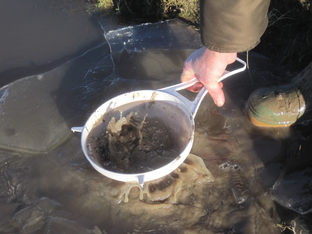 Breaking the ice to sieve for mudshrimps – and mudshrimps in an enamel pie-dish