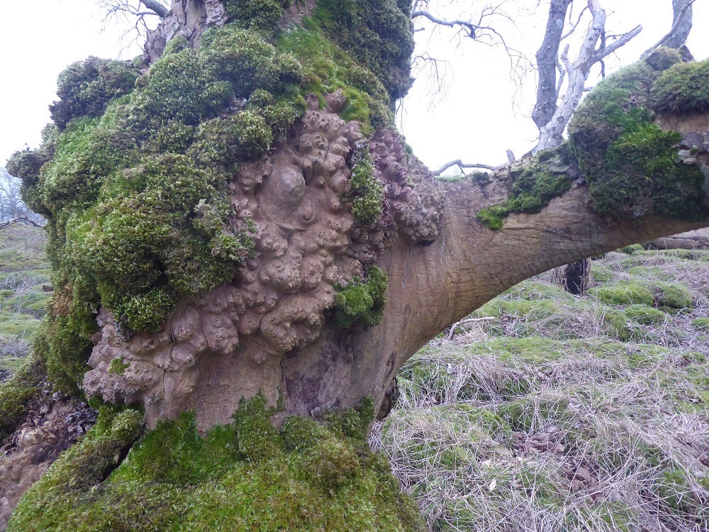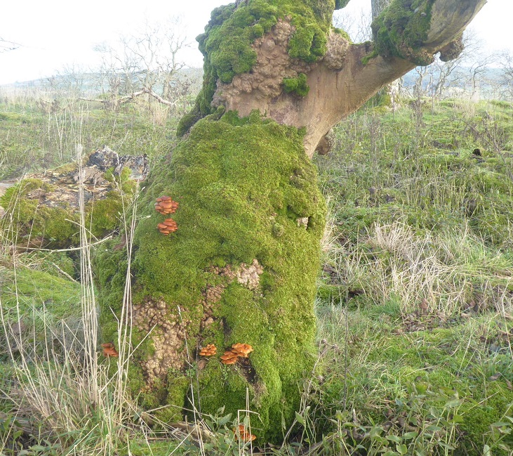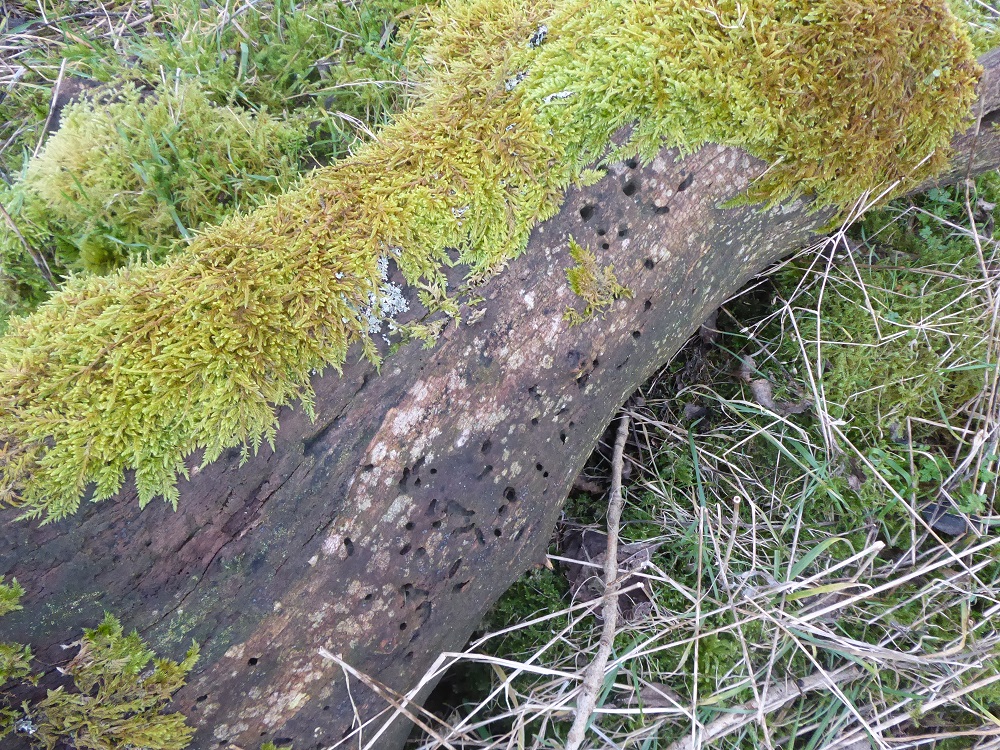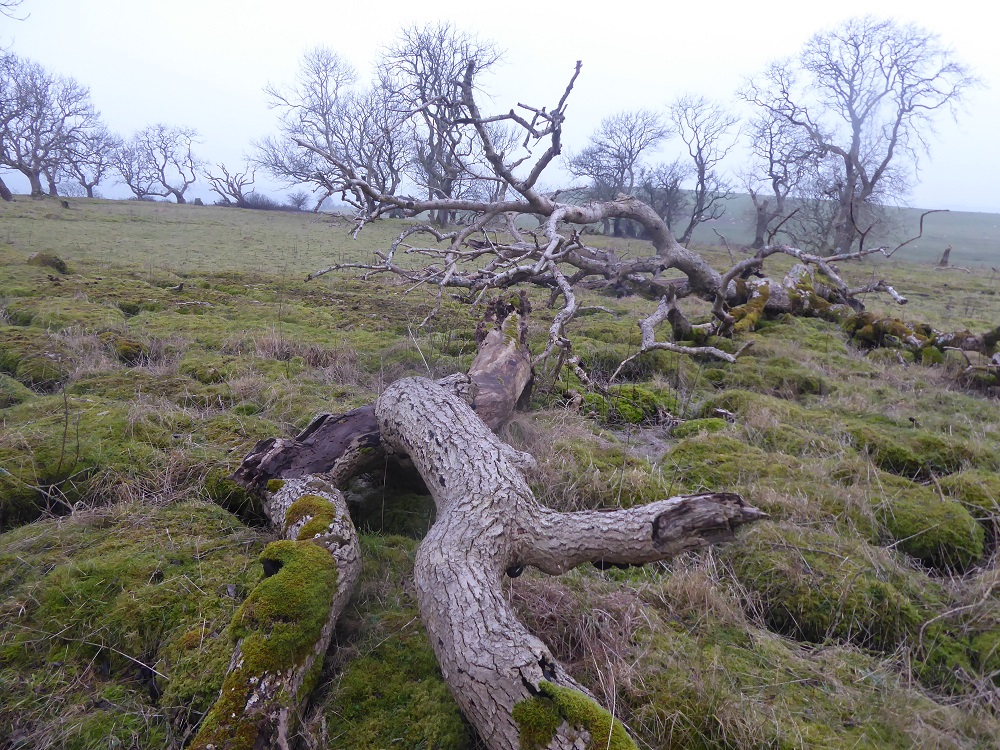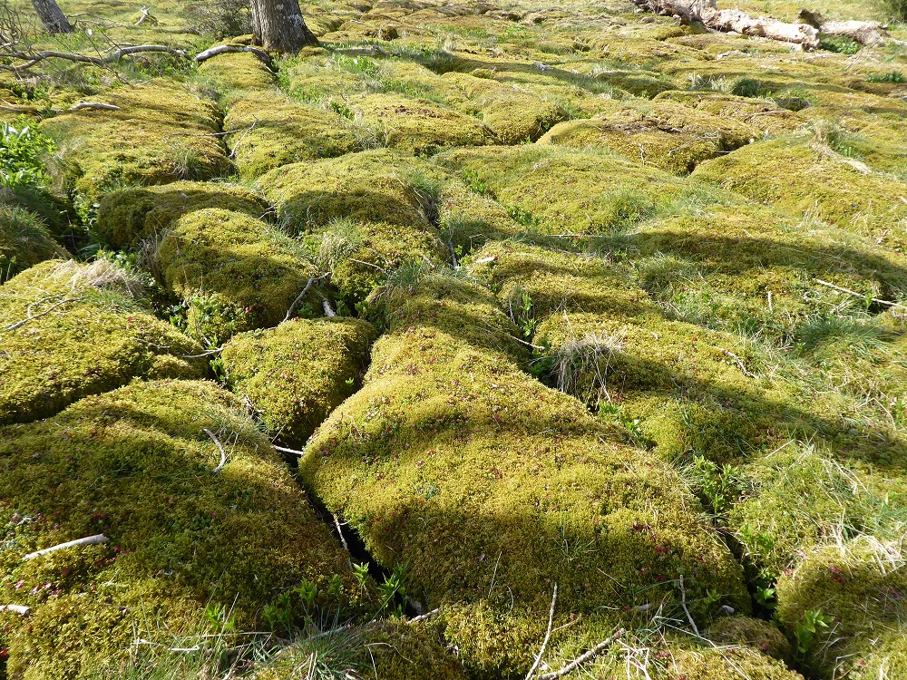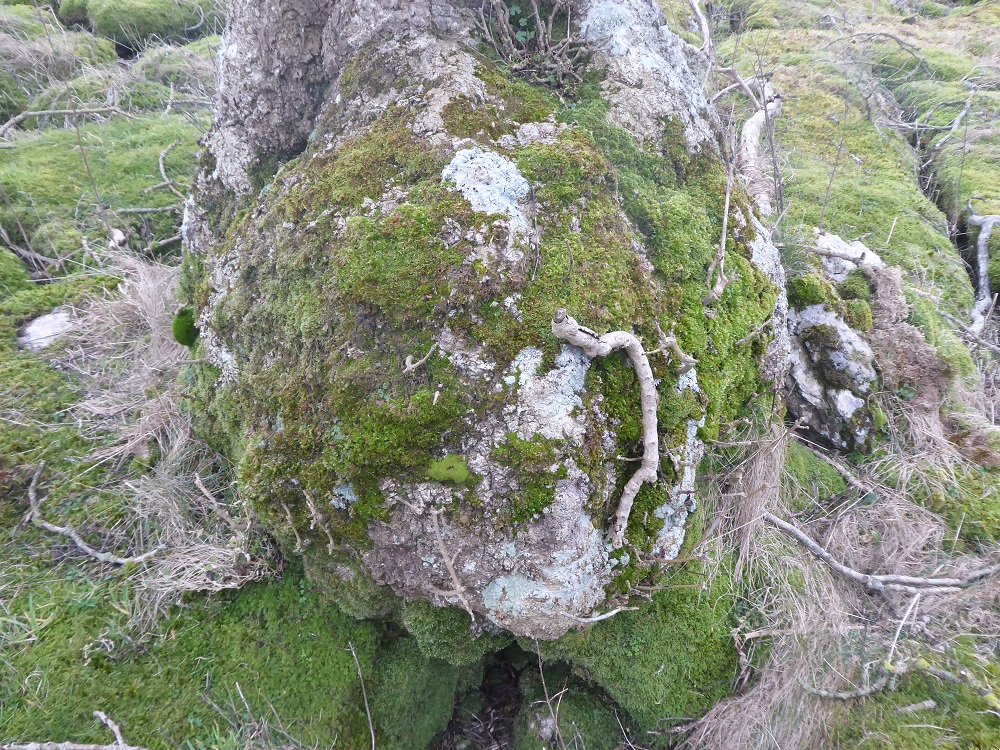 Area2, January 2022: moss, dead grasses, sheep track, burrs and lumpy boles