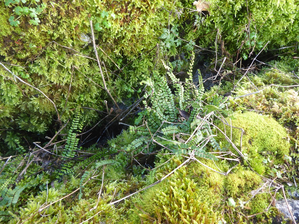 Area 2. The second section is heavily shaded in summer by ashes (many of which are dying) and hawthorns; the clints are almost obscured – walking over them becomes an exercise in concentration – by vegetation, especially mosses; rotten dead wood is a magnet for insects and woodpeckers, and luscious growths of fungi.