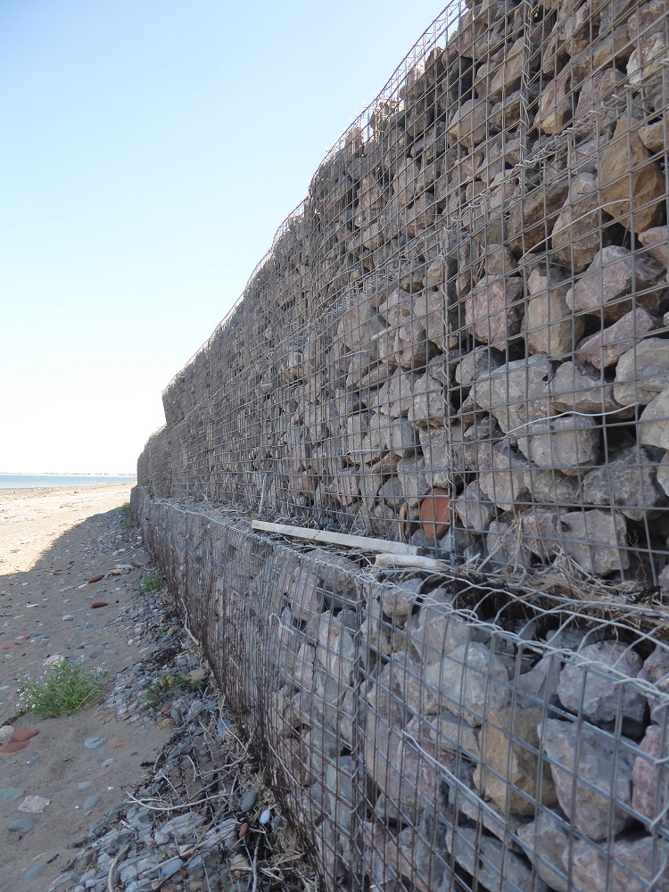 And also at the high end of protection against the tank’s waves are gabions – wire cages of boulders – and rock armour (only 5ml overtopped). This a very nice demonstration of how the rocks reduce the energy and therefore eroding power of the waves, breaking up the flow and forcing it in many different directions simultaneously.