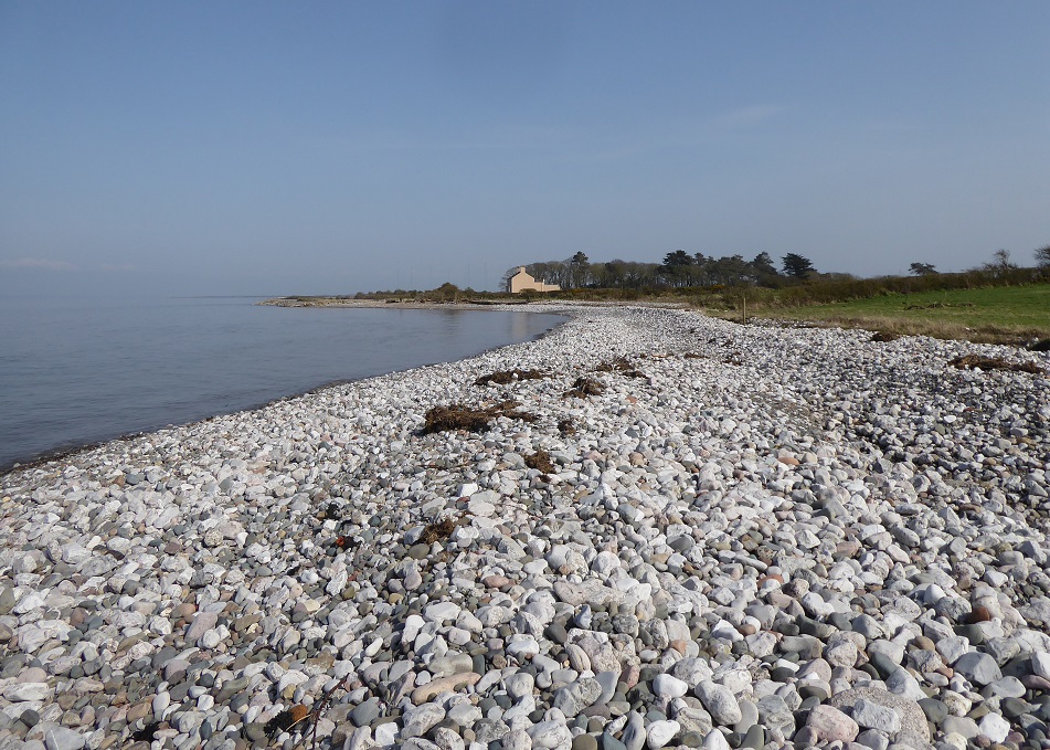 The shore here is dazzlingly white in the sunshine, and glimmers even on a dark and cloudy day, for it is covered in pebbles of limestone that have been churned and cleaned by the waves. The pebbles are round and smooth, and too numerous to have been broken off and eroded from the large boulders; they are likely the ‘quarried cobble’ referred to in the Cumbria Coastal Strategy for Silloth to Skinburness (see note below).