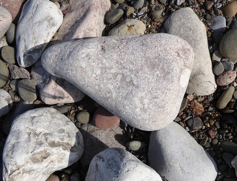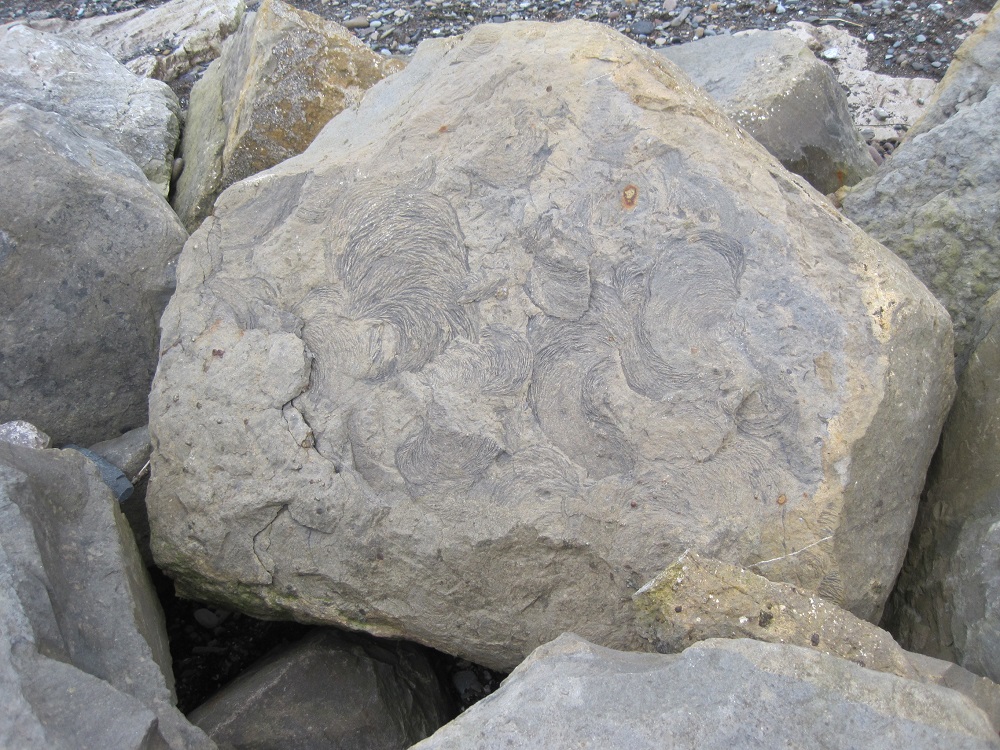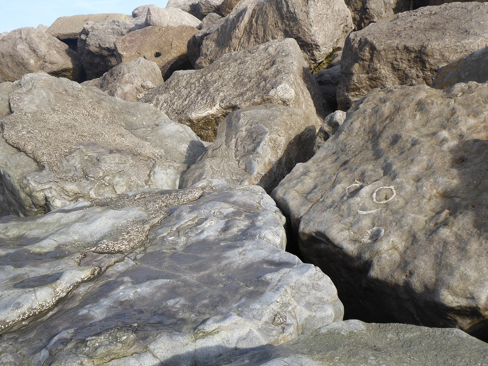 I first became aware of fossils in limestone rock armour some years ago when I stopped at the shore-side carpark at Parton, just North of Whitehaven; these were ‘trace fossils’, traces left by an animal rather than of an animal. Imagine, say, a polychaete worm or a bivalve mollusc that lives in a burrow in the sand. It’s sedentary, staying put in one place, so, rather than roaming around on the surface to look for food (and exposing its own vulnerability as prey), it waits for food to come to it. In the case of the polychaete, the worm extends its crown of tentacles like a net in the water, or sweeps its tentacles over the surface of the sand around the burrow. The burrowing bivalve, on the other hand, has a muscular tube, the siphon (rather like an elephant’s trunk in its mobility and sensitivity) which hoovers up food particles from the sand around its burrow. These feeding movements could leave the sort of arcs of indentation that are seen in the Parton traces. What class of animal left the fossilised traces of its feeding? It’s impossible to tell although geologists, hedging their bets, often refer to the marks as ‘zoophycos’.