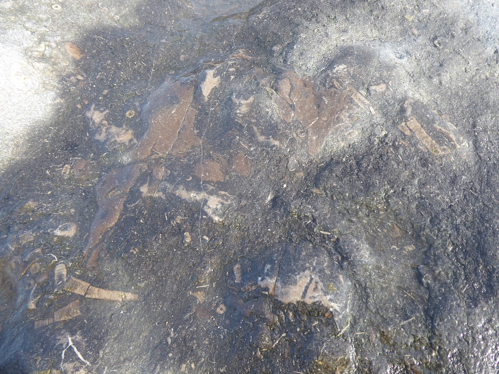 At North Shore beach, Whitehaven, the fossils in the rock armour are even more impressive. As I scrambled over the rough, pale boulders I was asked a couple of times what I was doing by local dog-walkers, who were then surprised and impressed when they saw the (previously unnoticed) fossils of solitary and colonial corals. There were thick bands of colonial corals; there were curving longitudinal sections, and the packed circles of colonies broken transversally. It was easy to imagine the colourful masses of the little filter-feeders extending their tentacles to capture food borne by the incoming tide. Here too were pale curved sections through the dished shells of brachiopods, sometimes solitary, sometimes clumped together by the currents of the warm Carboniferous sea, to lie on the sediment surface.