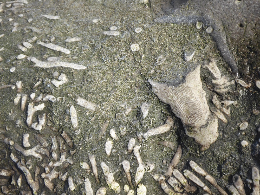 The use of dolerite is a new departure, because nearly all of the other stretches of rock armour are of limestone – and this is where rock armour becomes fun. Fossils! Corals, solitary and colonial; crinoids; brachiopods; and ‘trace fossils’ – they are all there, if you have the patience and courage to clamber amongst the boulders to search.