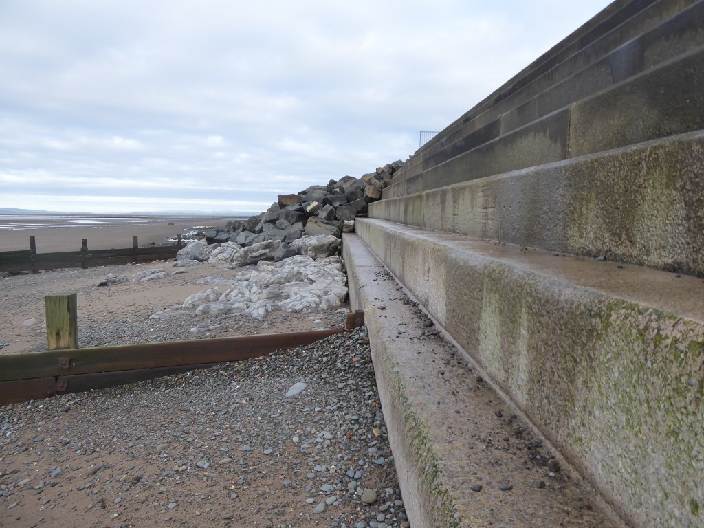 North of Dubmill: a mixture of groynes, concrete ‘steps’, and 2 types of rock armour