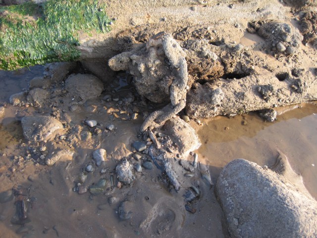 The patterns of newly-exposed clay and peat at Allonby suggest this might have been a soggy area like the lagg fen that circumscribes a bog, where trees find it hard to grow; after the sea-level rose and the fen was inundated, the hollow trapped water-borne detritus; sometimes sand was deposited on top of the peat; a ray’s egg-case was caught in a crack and later buried. Later, when the peat and clay were higher and drier, fresh water seeped down through the peat and onto the clay, carrying red iron salts that accumulated in holes and hollows. And here at Allonby these colourful ferric salts accentuate another puzzle: tubes with hard, ochreous-red walls projecting upwards from the clay.