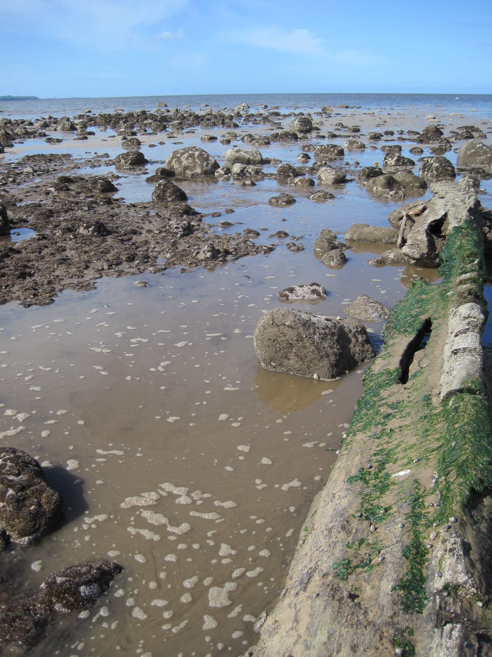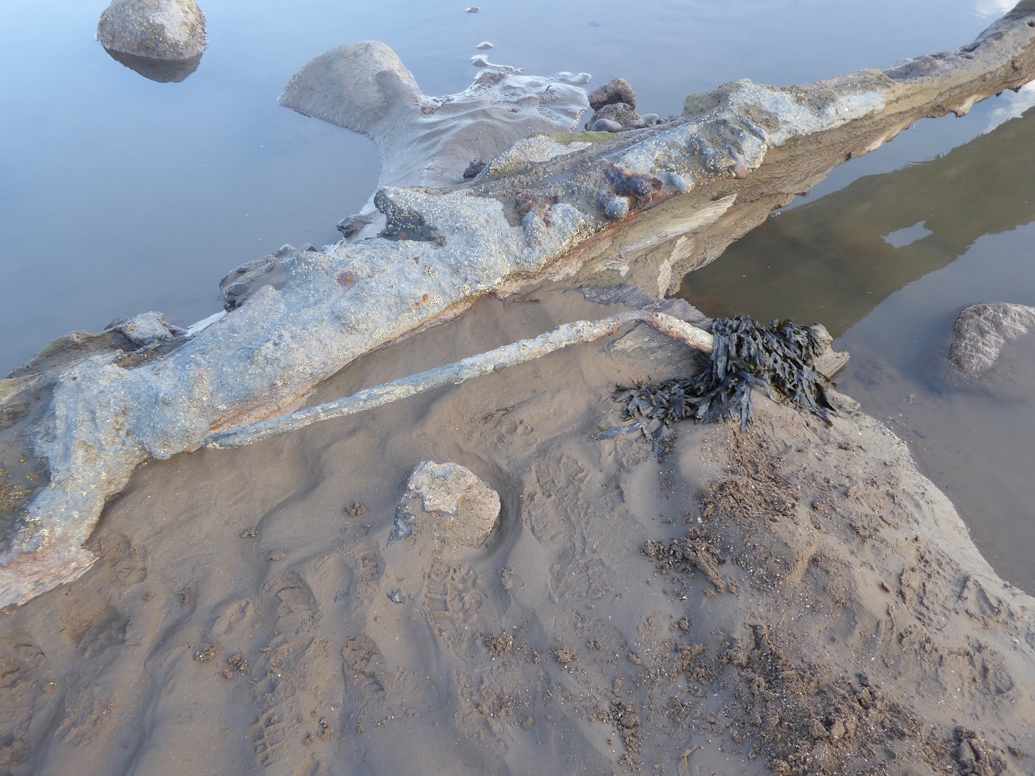 But then, on April 19th 2022, I did my first low-tide guided shorewalk for about 2 years – and although the rocks of the Scaur weren’t obvious, the morning sun was catching the long, low shape of solid mass. And although it was much reduced, there again was the ‘ship’s keel’! It looked very different. It seemed to have been tilted to reveal much more metal-work than before – a long rod, and a metal band along the top surface. A few Sabellaria worms had built a small colony of tubes – but the former rich habitat had been scoured and depleted. Nevertheless, it was good to re-discover ‘an old friend’.