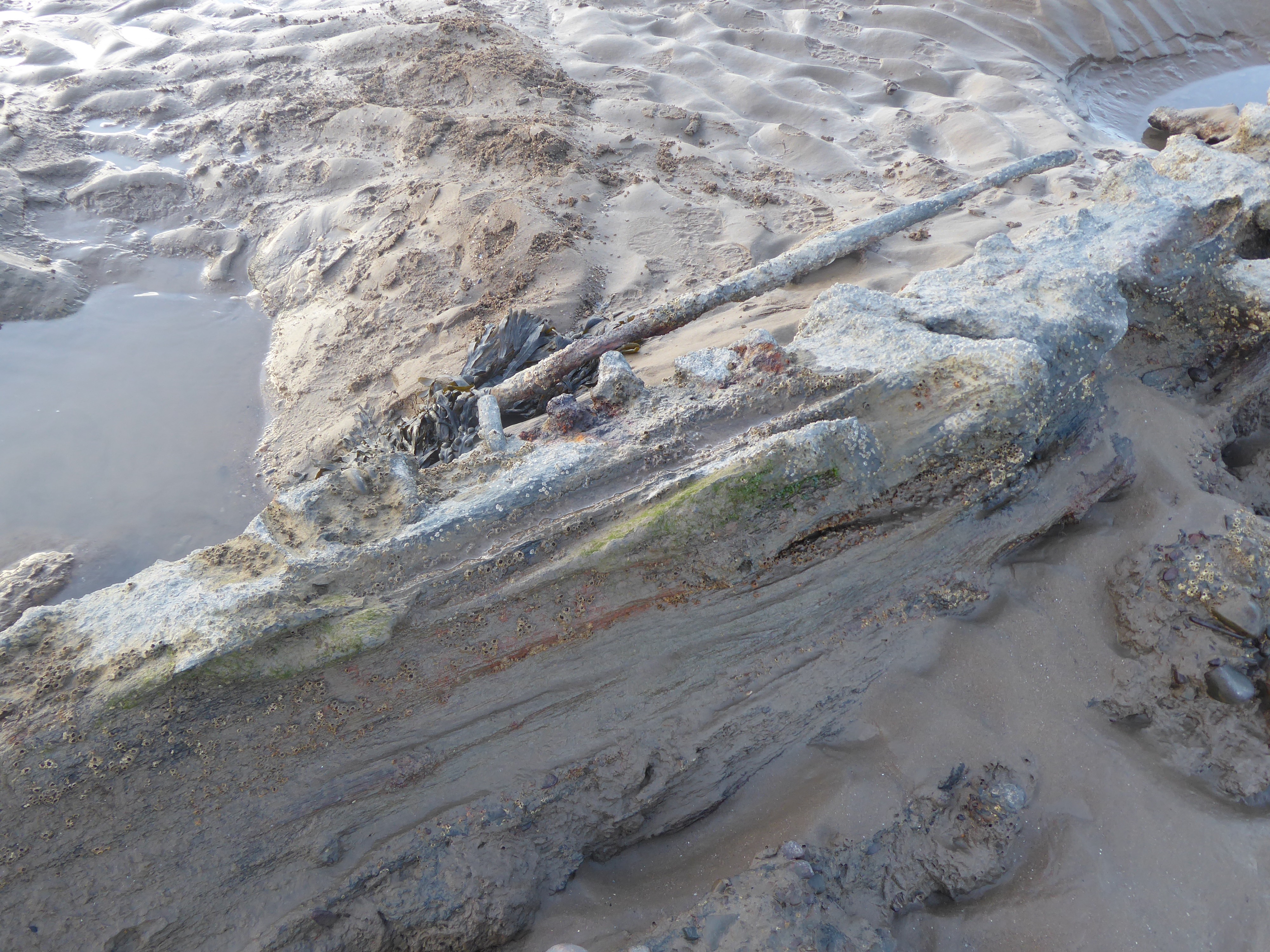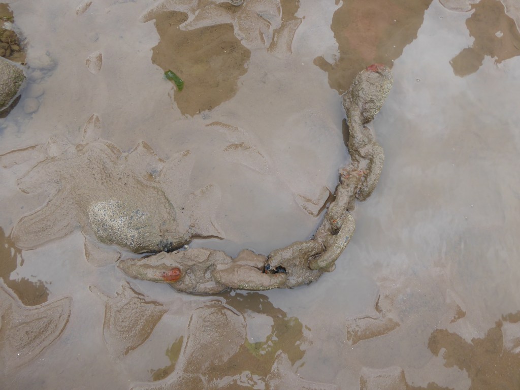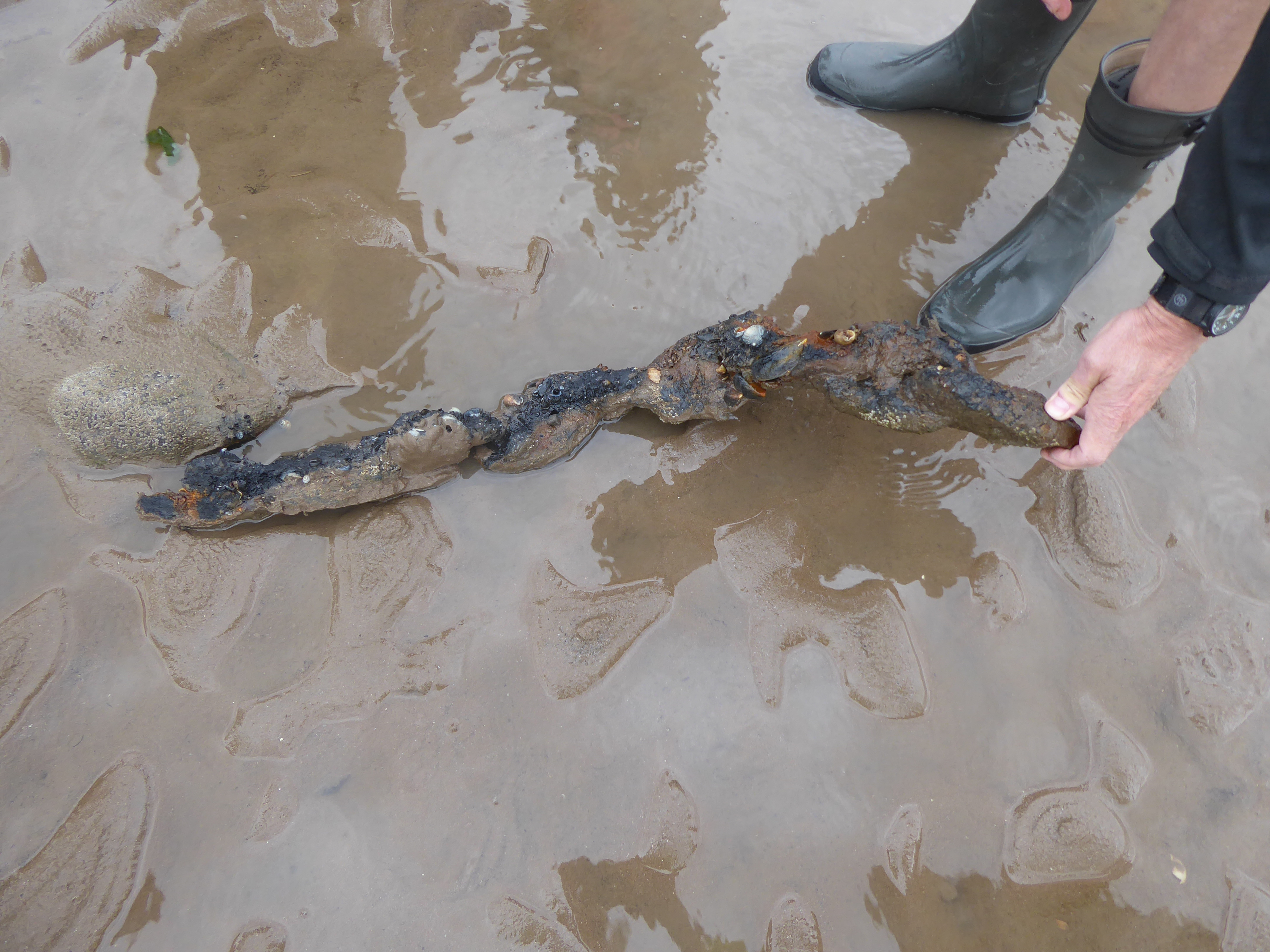 In July 2022, we rediscovered the chain, now separated from the hulk by several metres. And on my most recent guided shorewalk, in August 2022, the chain was still there, part-buried in the sand, but its rusted links – encrusted with long-dead shells – were still free to move when the chain was lifted free. We buried it again, in the hope that it will stay near the timbers it once helped anchor.