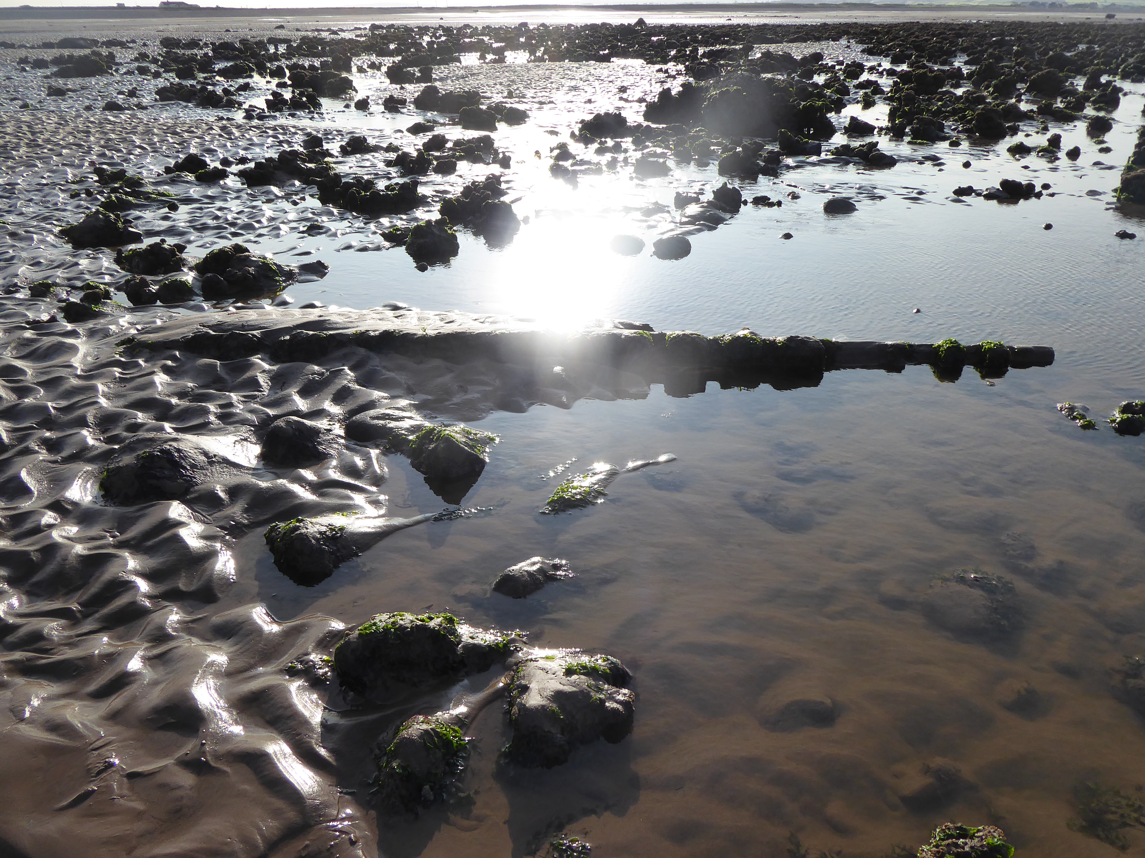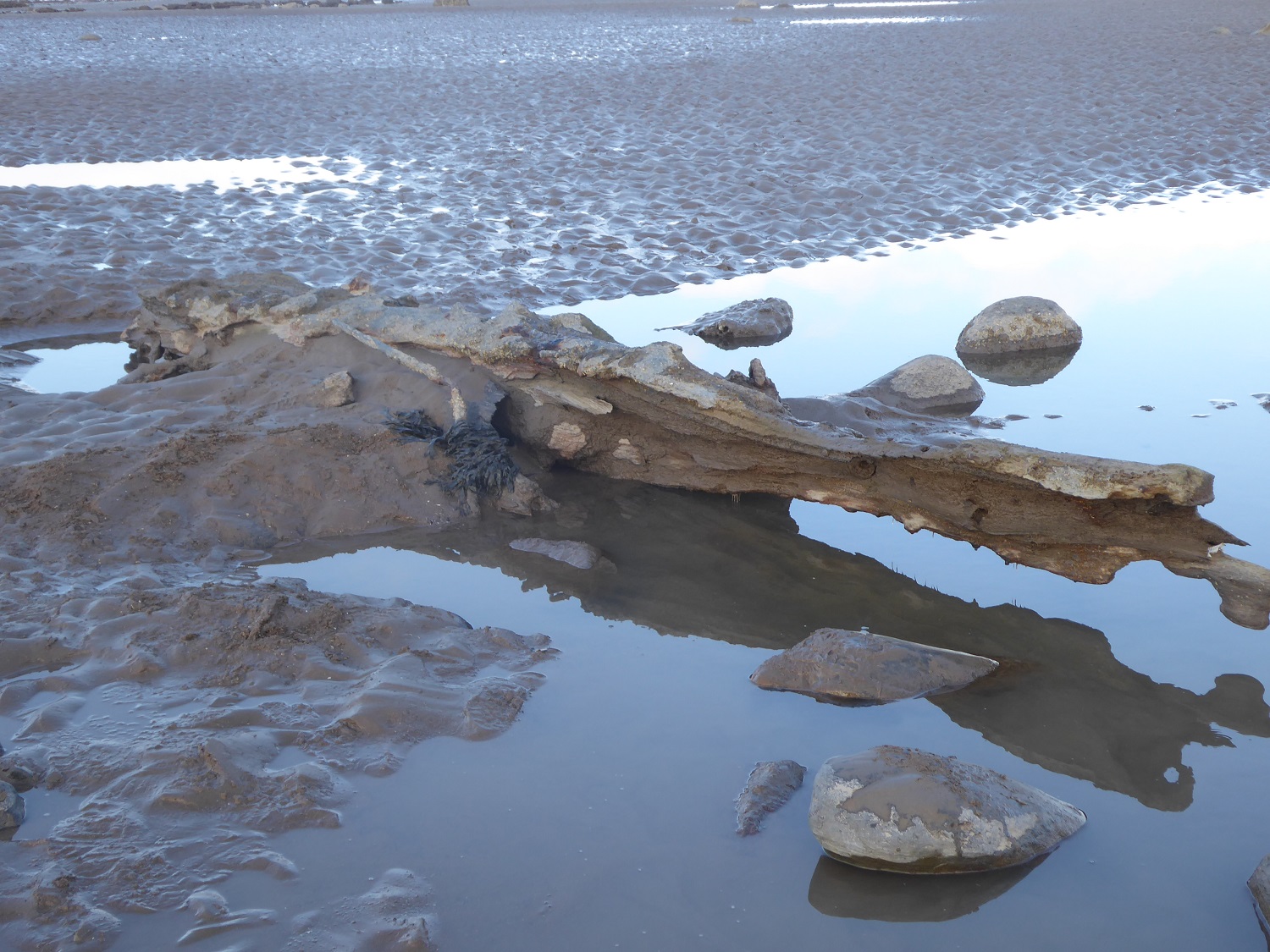 “the patches of black are like shadows along the sharp edges of channels in the sand. Walk down towards them, and the shadows resolve themselves into banks of peat. Poke them with your toe and feel how dense and sodden they are, smoothed by the friction of waves and sand. Walk on them and feel their sponginess. And gradually you will become aware that the dark organic mass is not only peat, but supports here a horizontal tree-trunk, or there a stump that radiates roots. Wander around and you will find trunks and branches, single and entangled, embedded in the peat and sand; and erect stumps, 20-30 cms high, their tops flattened as though cut by a chainsaw. The wood is still fibrous, soft and dark; you can crumble it and tease it apart, as though it were any rotting log in a woodland. But the difference is that this woodland thrived about 8000 years ago.”