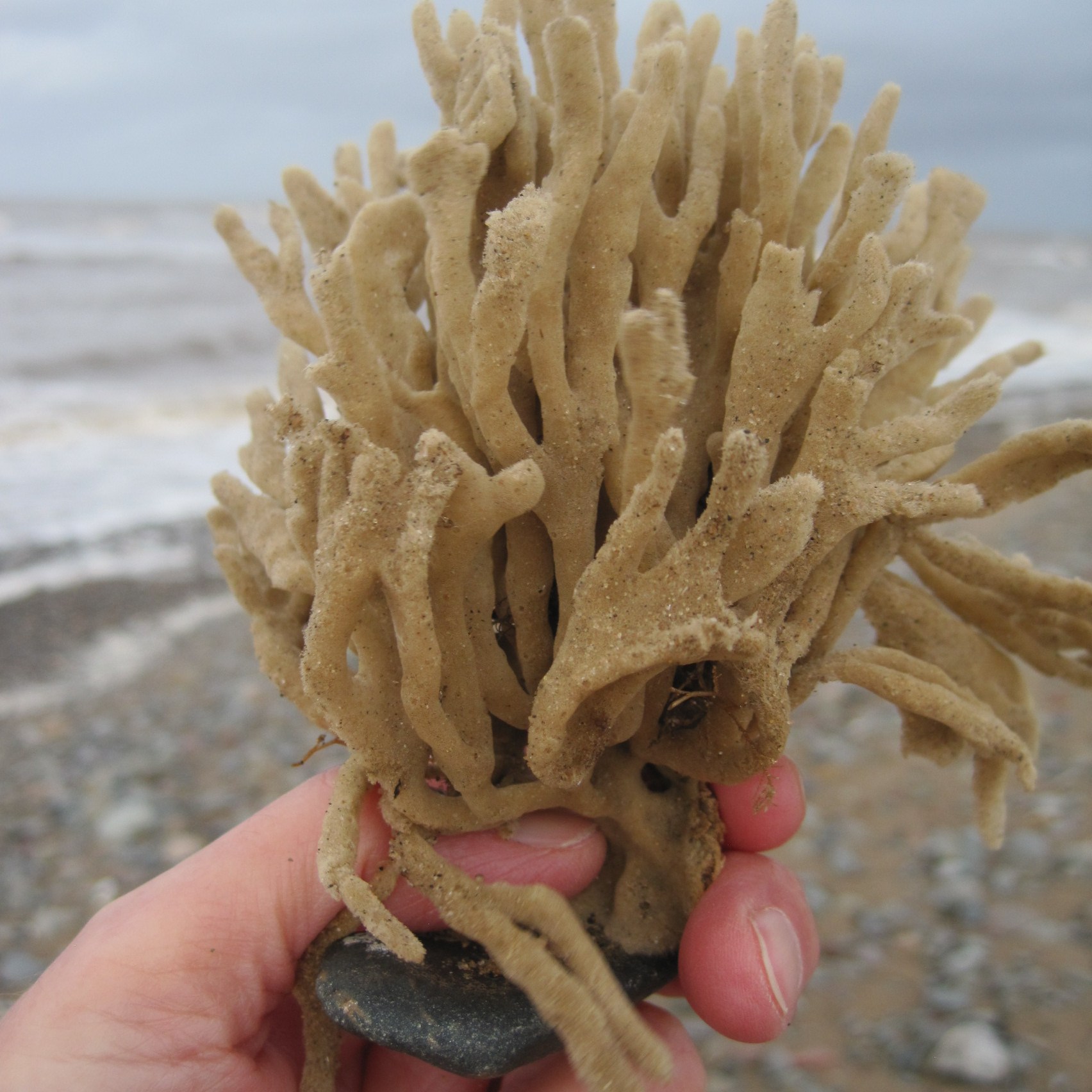 Upward growth, though, is caused by ‘topping tides’, the high Spring tides that happen when the Moon and Sun are in alignment and their gravitational pull is greatest. Then, the water, “brown with muck”, creeps in through the creeks and overspills onto the Marsh. The vegetation creates at its base a layer of still water from which the sediment precipitates out. On a big tide, there’s a relatively long period of slack water at the head of the Firth, which means a longer period for sedimentation to happen; as much as 1cm of silt might then be deposited within a few tidal cycles amongst the grass and herbiage. When Giles had given me a tour of the Marsh he had jumped off the quad near the elbow of the Esk, next to a line of fence posts. “They’re gradually getting buried,” he says, lifting his hand to indicate they were nearly one-third higher when knocked in.